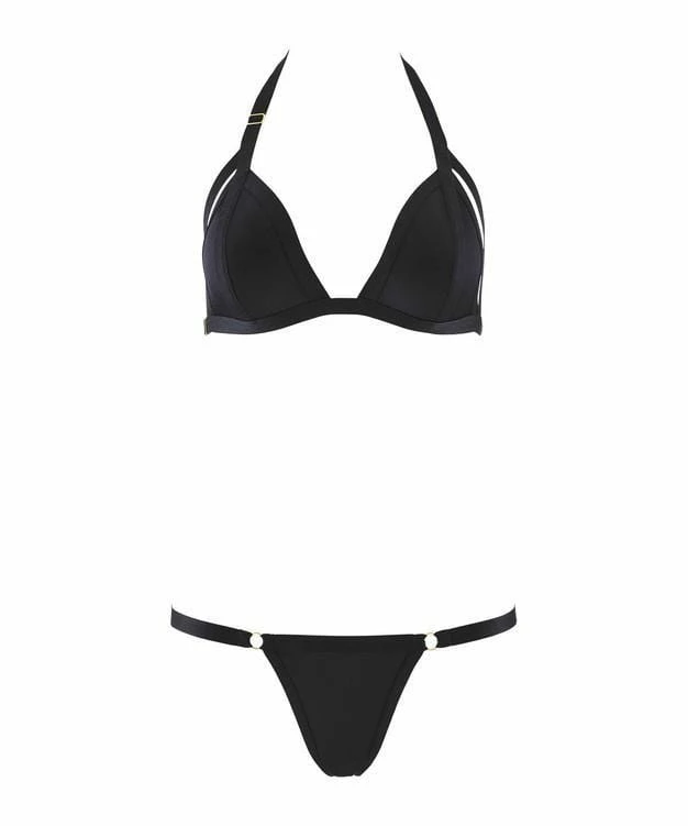 Aubade Boîte à Désir Magnet Set of Desire. Bra and panty set made with black satin mesh and straps for a hint of bondage and plenty of fun. Silky smooth texture and satin add a shine to the set and straps accentuate the feminine form.