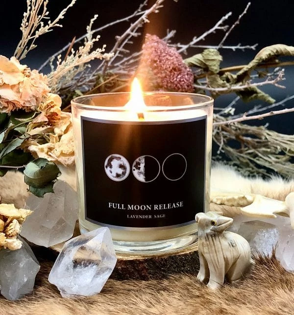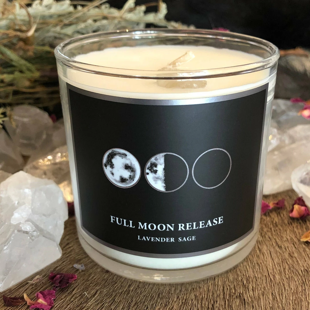 Cotton wick, GMM-free soy wax, organic coconut oil, proprietary blend of organic essential oils encasing a crystal charged under the full moon.