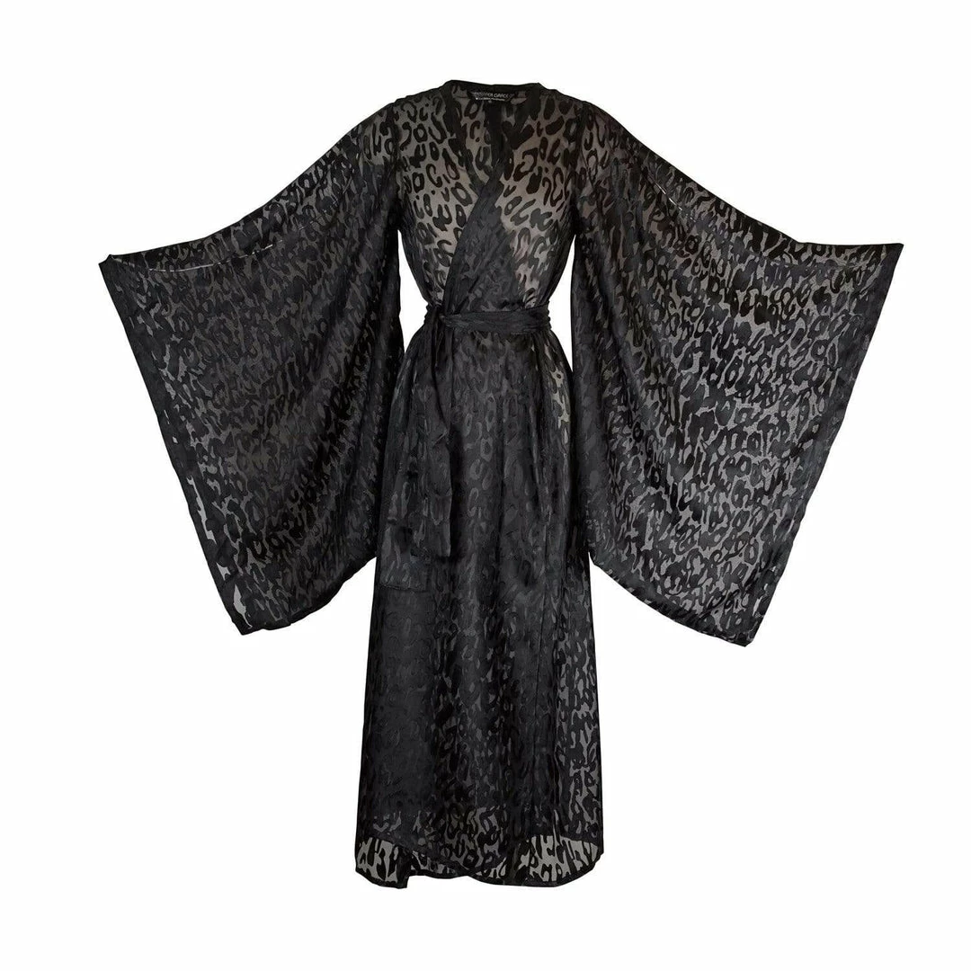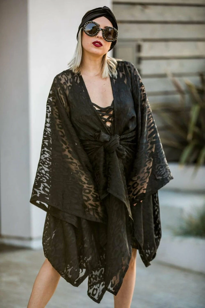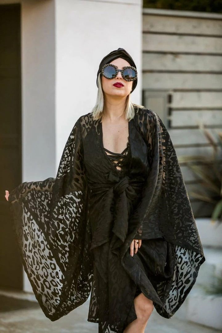 This abstract animal print kimono was handmade in San Diego, CA with a sheer black burnout chiffon. Featuring pockets and a matching waist tie-you can style this piece in at least 10 ways!