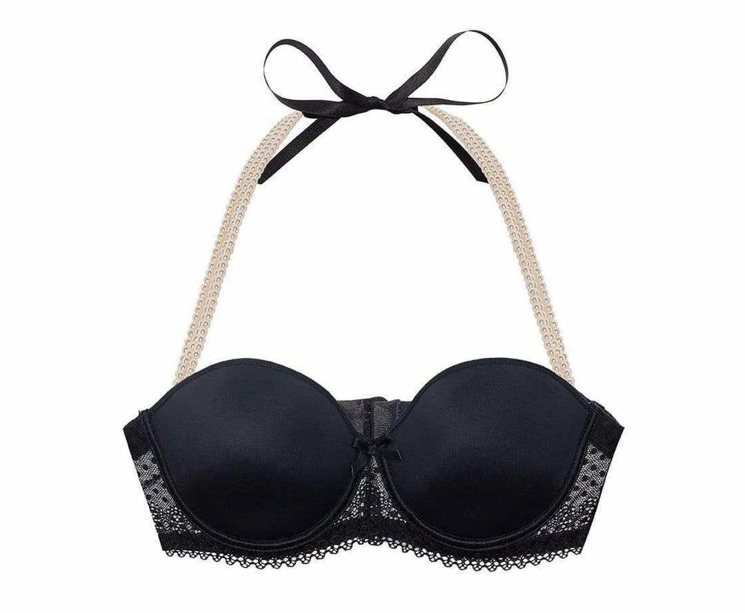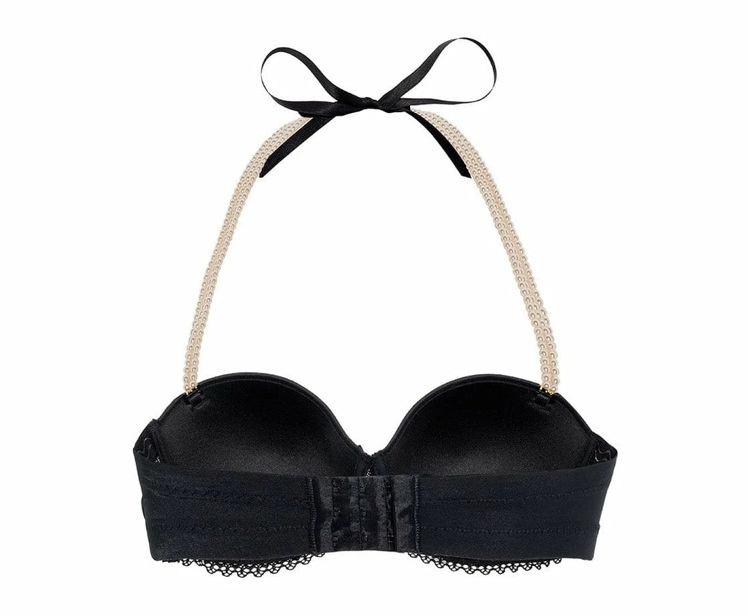 The base of this design is an underwire bra with French lace on the sides. The sophisticated touch is the amazing strap made of three pearl strips, which may be removable to become a strapless bra.