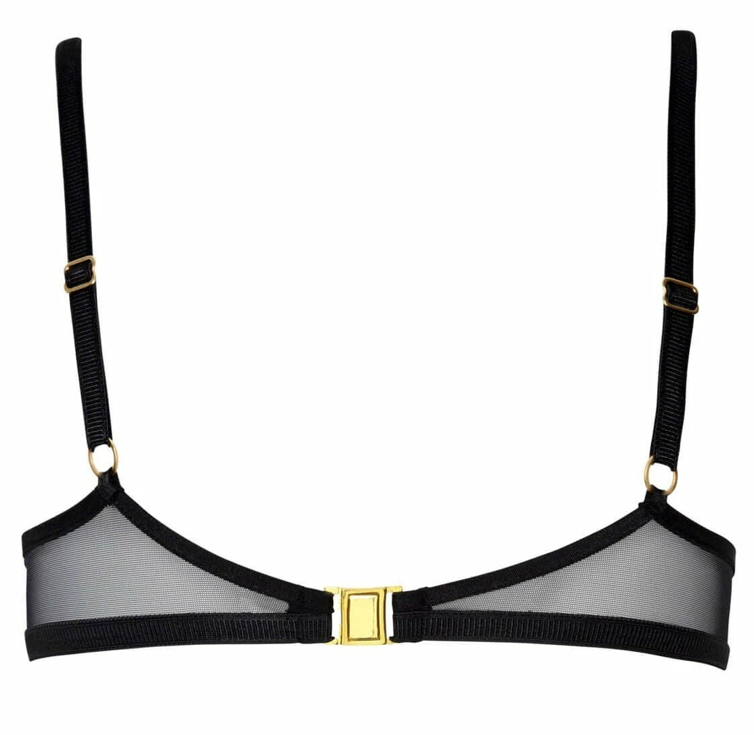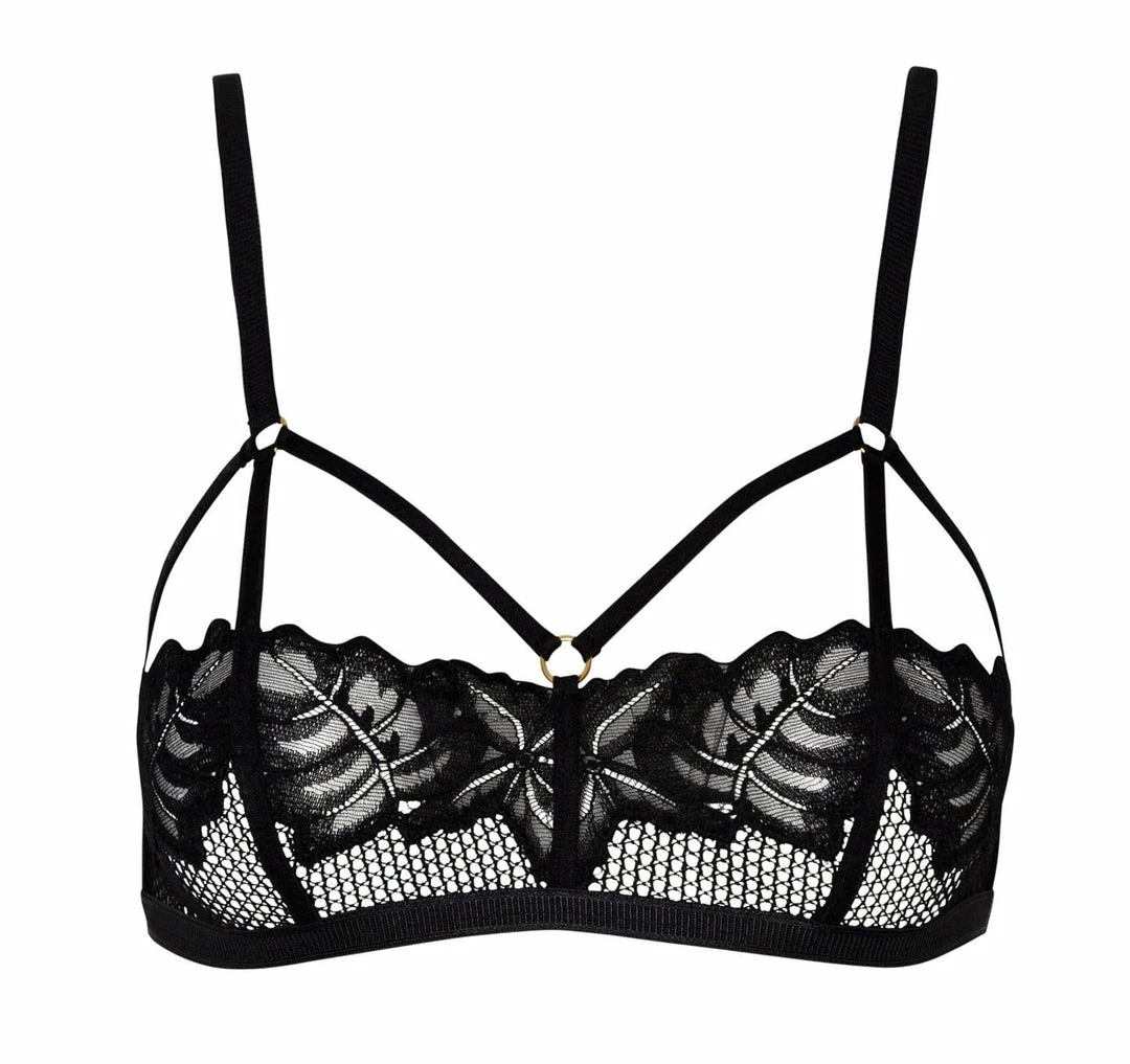 Lace demi cut bra covers and support the base of the breast while leaving the top half exposed for a playful and sexy feel. Strappy design leading up towards the straps of the bra give it an even sexier bondage feel.