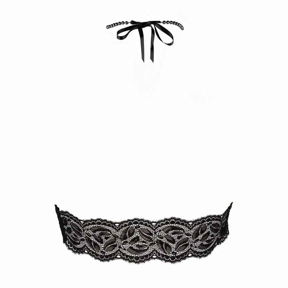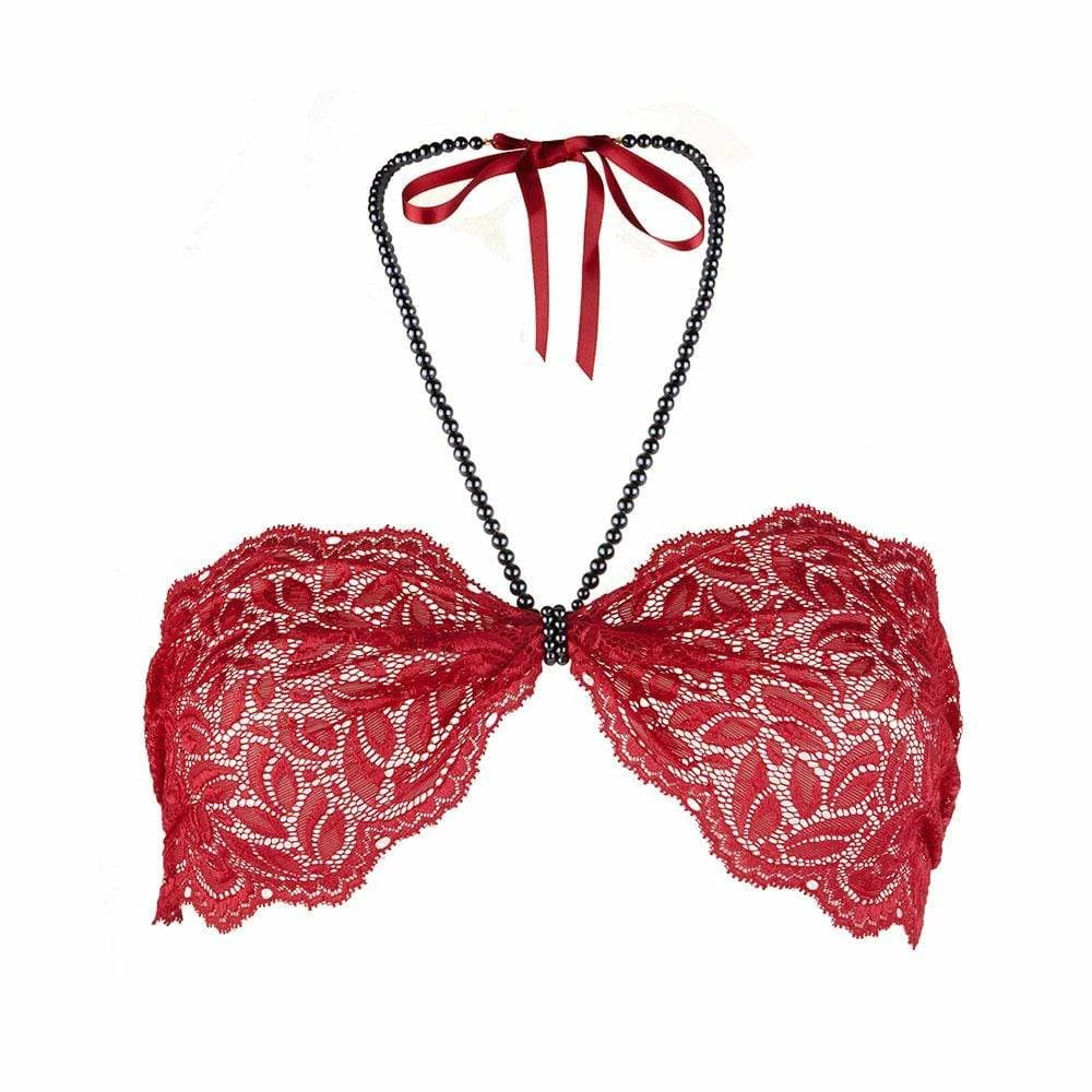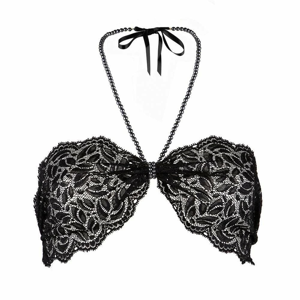 Soft stretch French lace and strands of ebony pearls that snake up to tie behind the neck. This bra encases curves in delicate lace held up by strands of real pearls.