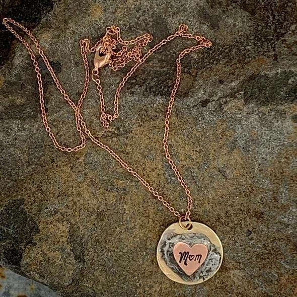This adorable design begins with a brass disc that the company solders the rose gold heart to, before stamping it with the word “Mom”.