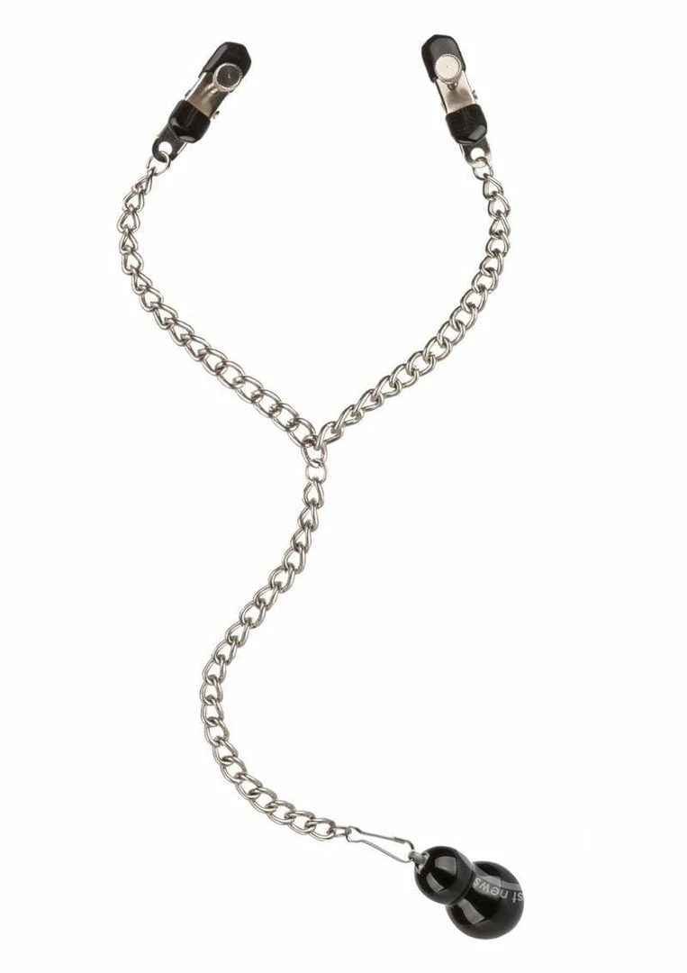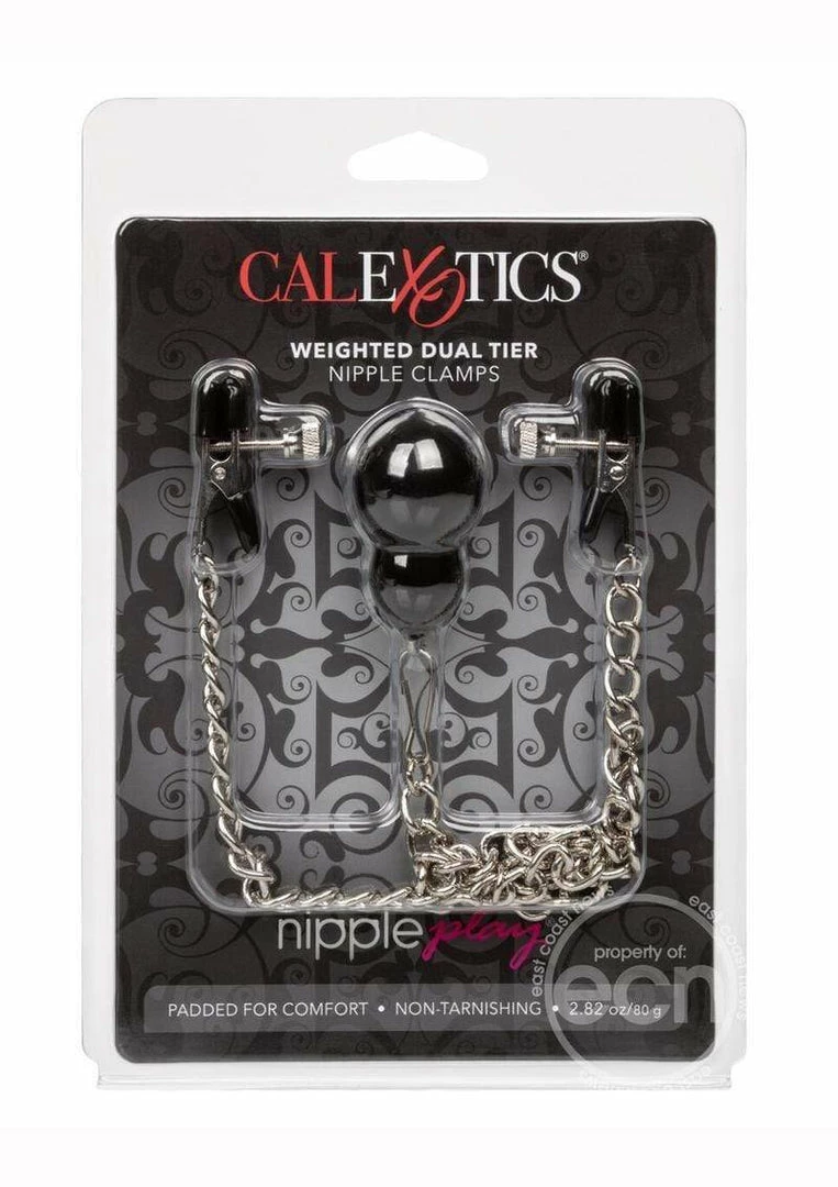 Weighted Dual Tier Nipple Clamps by CalExotics offers discomfort in the best way. Two padded adjustable clamps for the nipples connected together by a chain with a weight in the middle. Added tension for increasing arousal and desiree. Can be used in single or partner play by males or females.