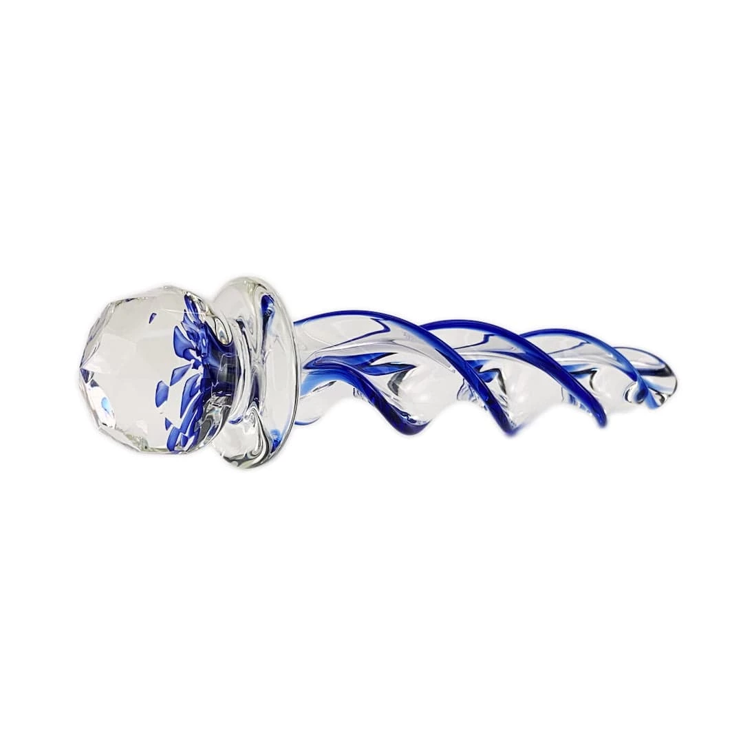 Your intimate pleasure is a work of art – and so is our newest Twist dildo! Hand crafted from a single piece of cobalt blue & crystal-clear hardened borosilicate glass, the aproximately 5″ to 6” (insertable length) twisted shaft is crowned by a glorious blue and white “implosion flower” held within a faceted and polished glass orb. It’s quickly become one of our all-time favorite designs – we believe it will be one of yours, too!