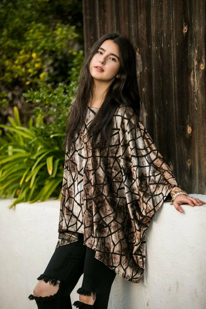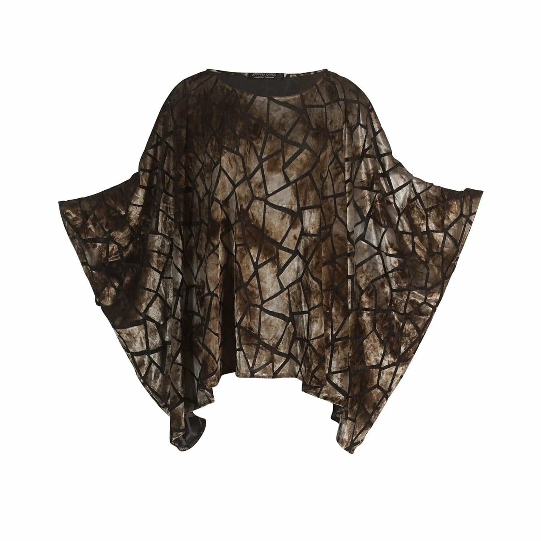 This gunmetal fractile print scarf top was made from a soft and slinky silk velvet burnout. With a simple and elegant silhouette, this top is One Size Fits All! Machine washable and wrinkle proof, the scarf top is perfect for travel!