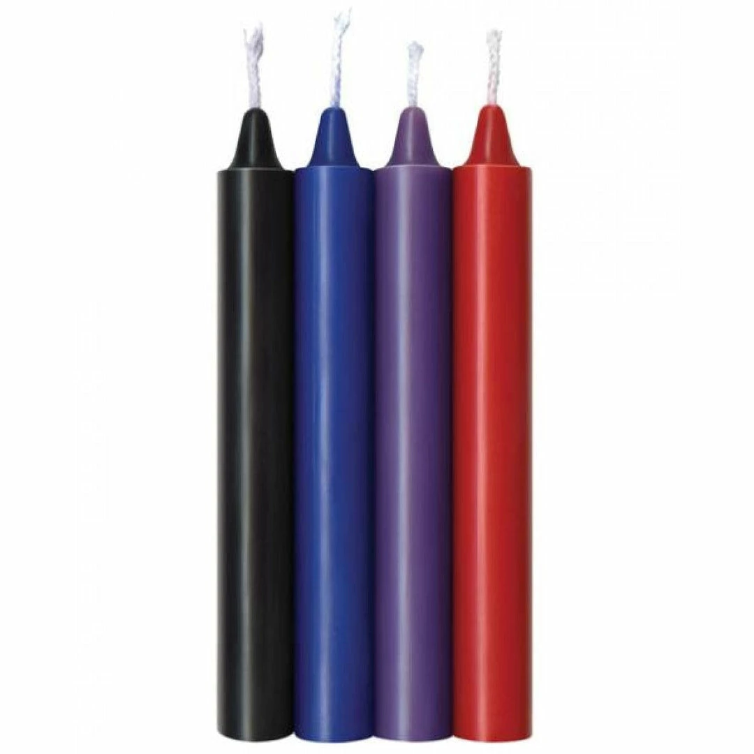 Perfect for titillating fun, these 4 wax-play candles have just a tinge of heat when dripped, and then quickly warm to the touch in erotic colors for a classically sensual visual experience. Assorted colors: black, red, blue, purple.