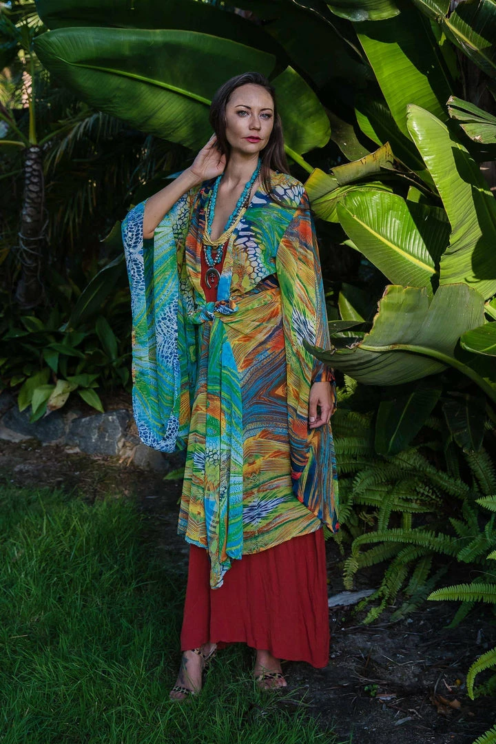 This adventurous tropical abstract kimono was handmade in San Diego, CA with incredibly soft chiffon. Featuring vibrant colors, pockets and a matching waist tie-you can style this piece in at least 10 ways!