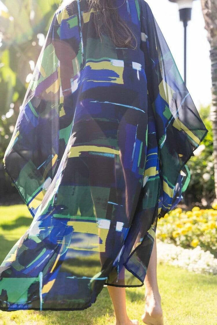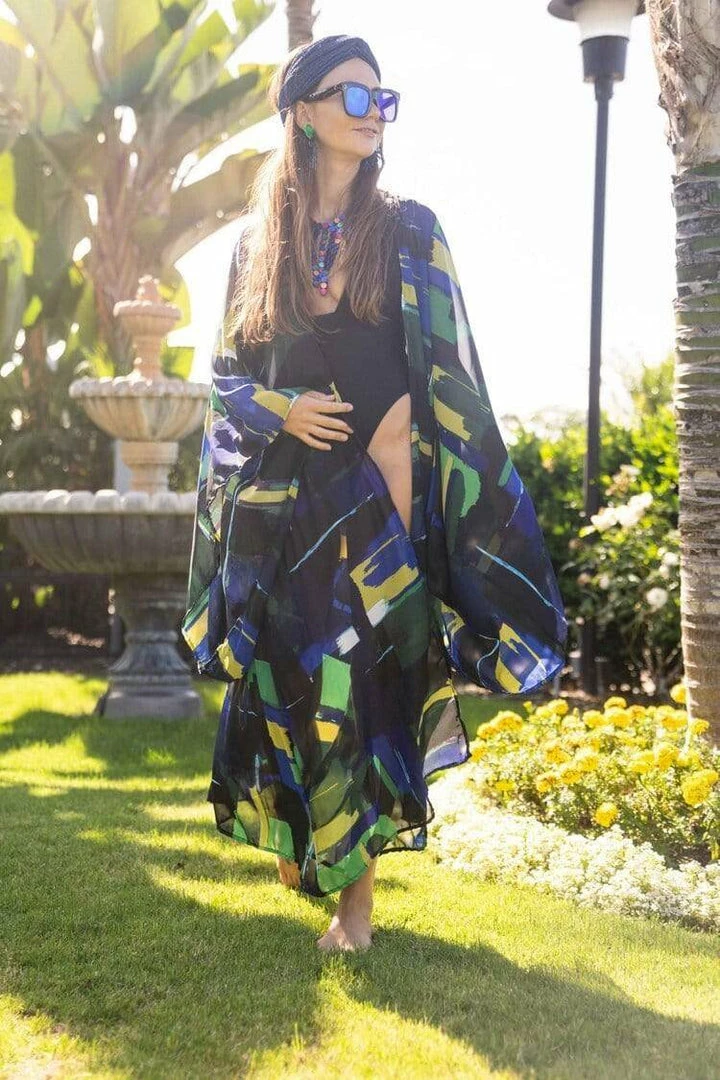 This black with electric blue/green swatches kimono was handmade in San Diego, CA with incredibly soft chiffon. Featuring pockets and a matching waist tie-you can style this piece in at least 10 ways!