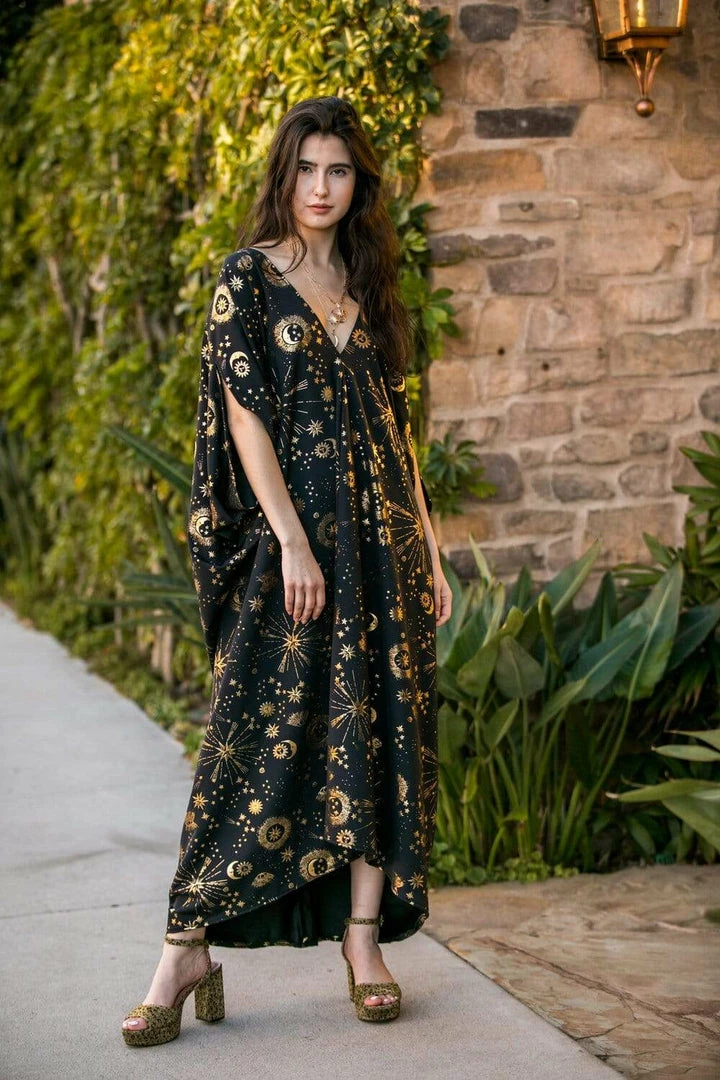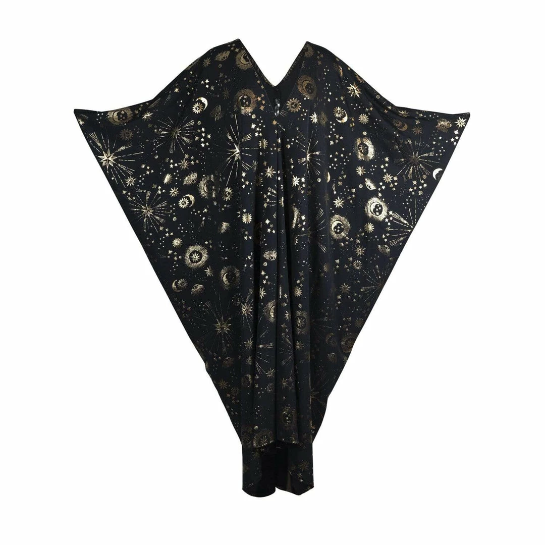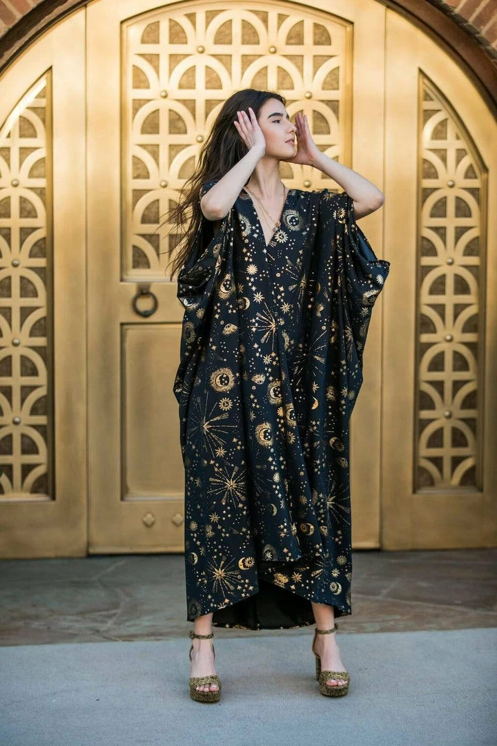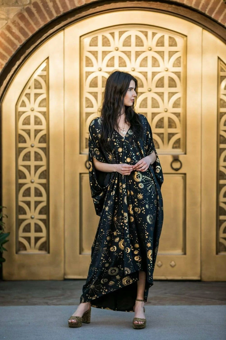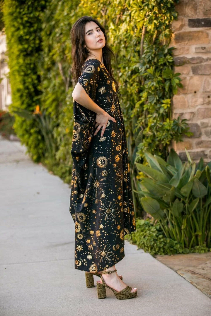 This iconic celestial print caftan dress was made with a black jersey knit fabric and lots of love.