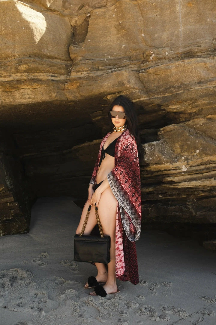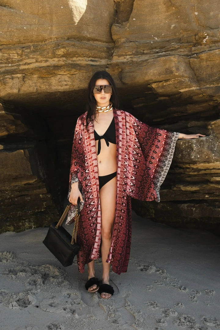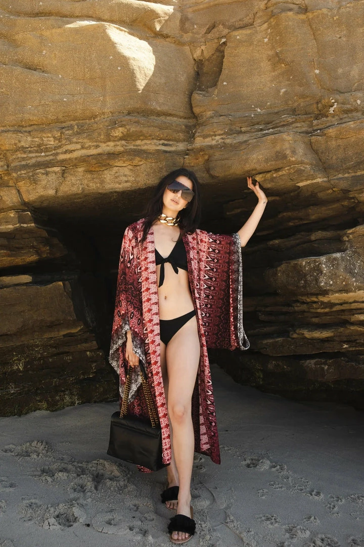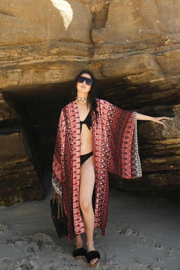 This bold kimono was handmade in San Diego, CA with a fiery opaque border snake print georgette. Featuring pockets and a matching waist tie, you can style this piece in at least 10 ways! Machine wash cold and hang dry.