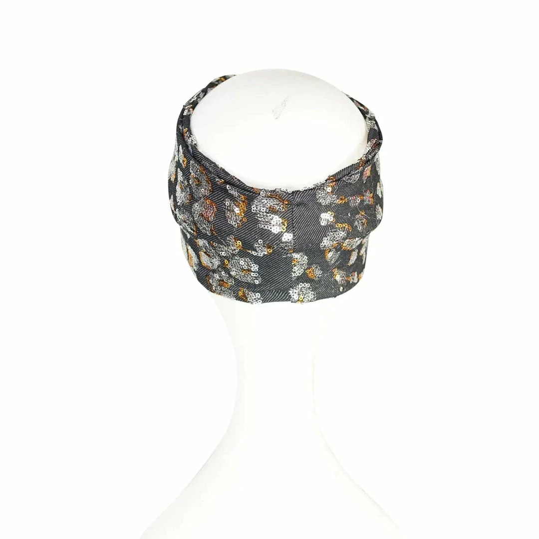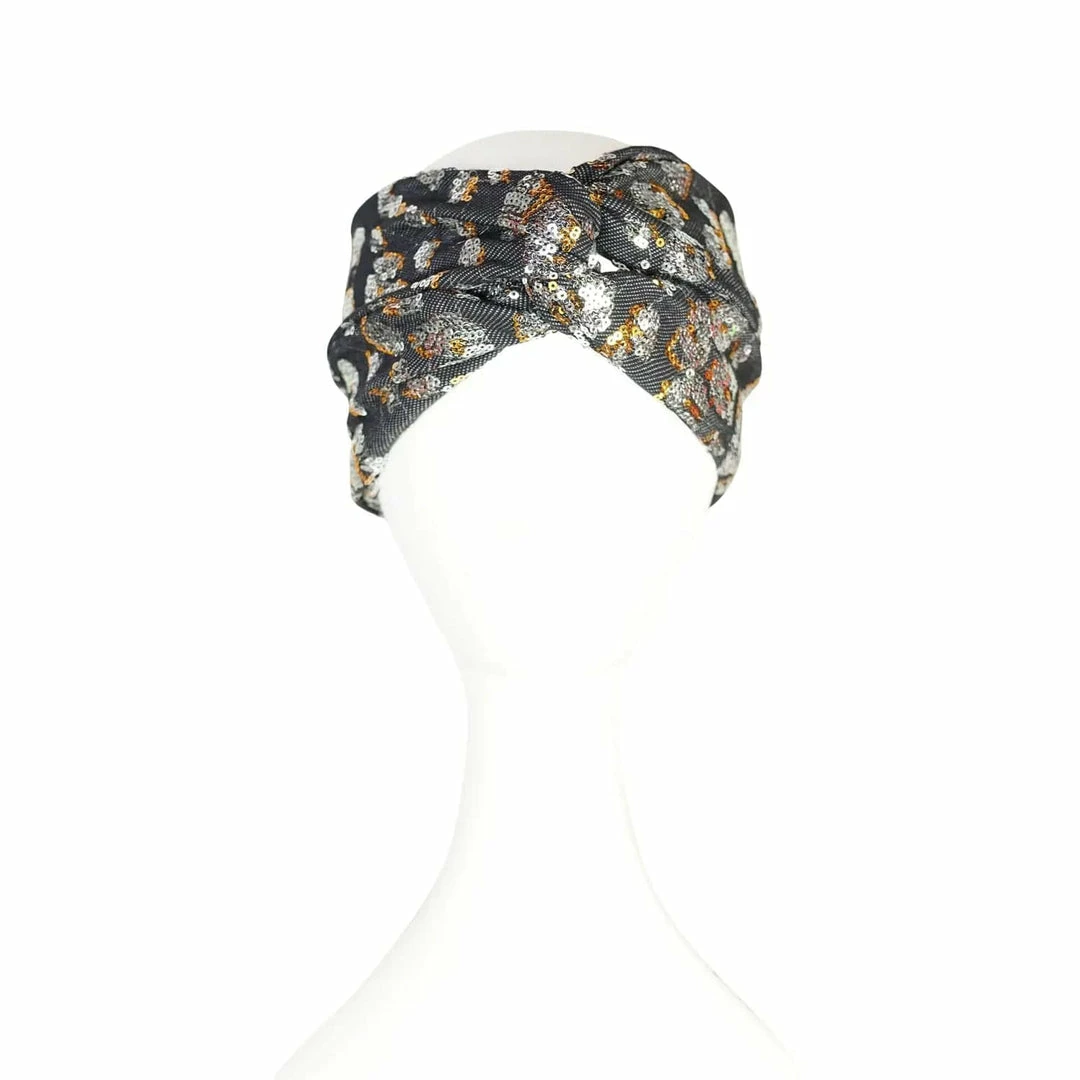 This turbanesque twist headband was handmade in San Diego using a luxe sequined denim-inspired knit jersey.