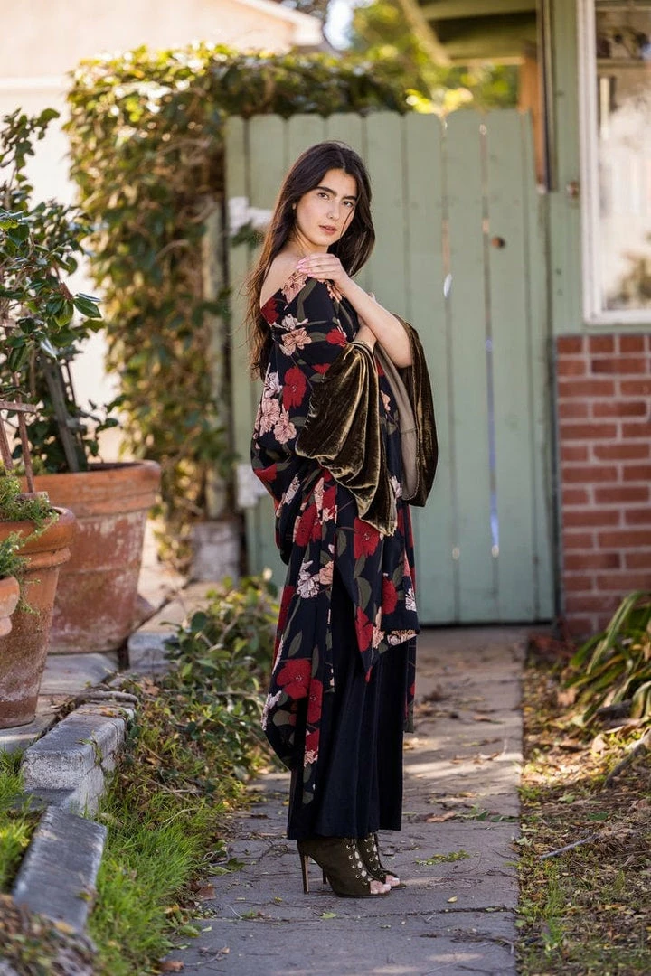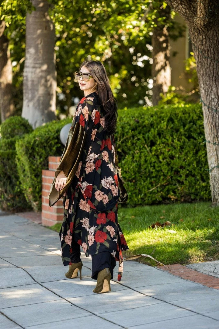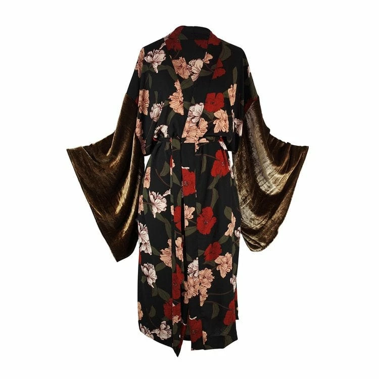 This mixed media kimono embodies gentle opulence with a unisex dropped-waist cut. Made with a soft rayon bubble crepe georgette and deadstock silk velvet sleeve.