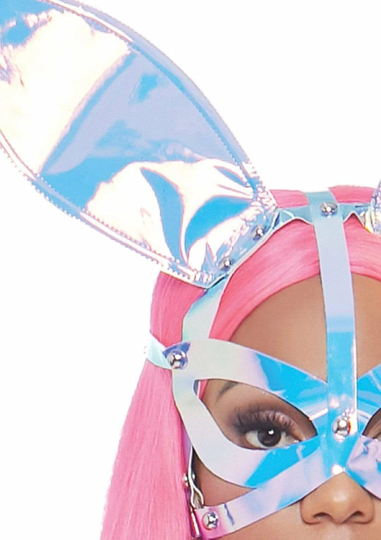 Take your bunny babe look to intergalactic levels of sexy in the Leg Avenue Holographic Vinyl Bunny Ear Mask. The daring holographic vinyl mask is complete with two shining bunny ears with a bold harness design and metal rivet accents. No matter how late the party goes, the comfortable head strap is sure to keep these ears on point. The soft, flexible vinyl is comfortable enough for extended wear.
