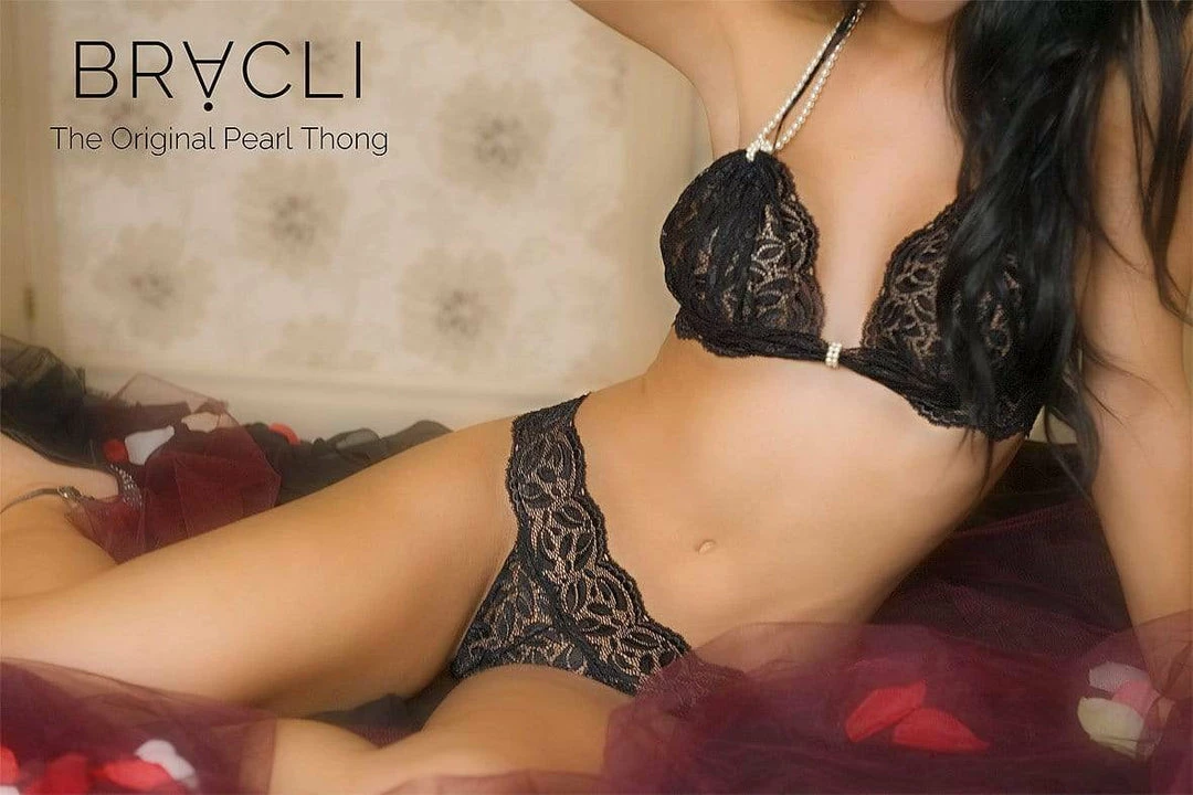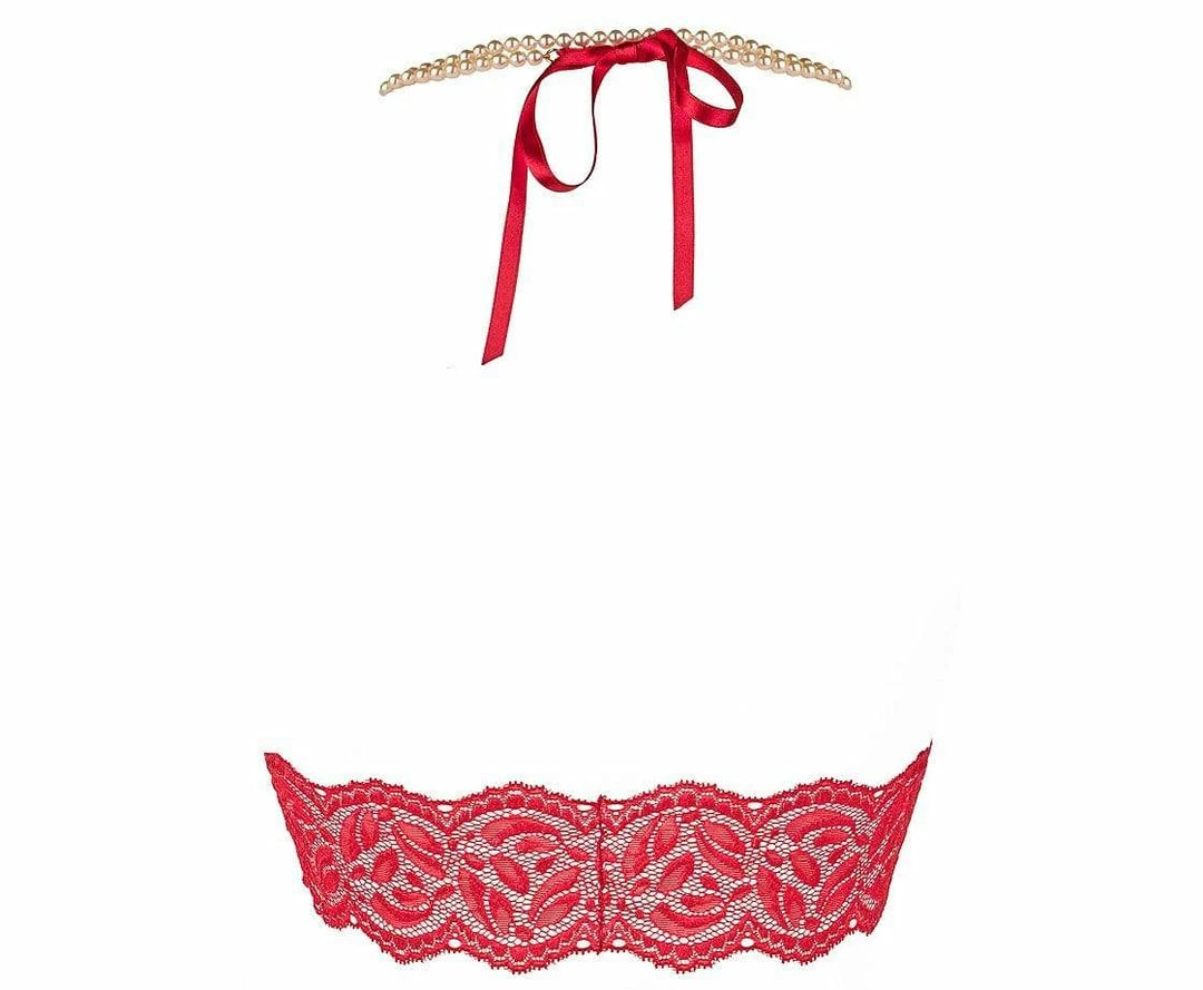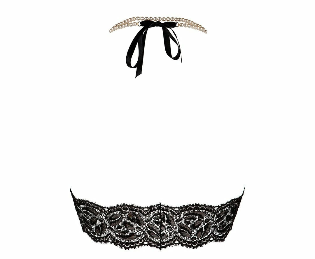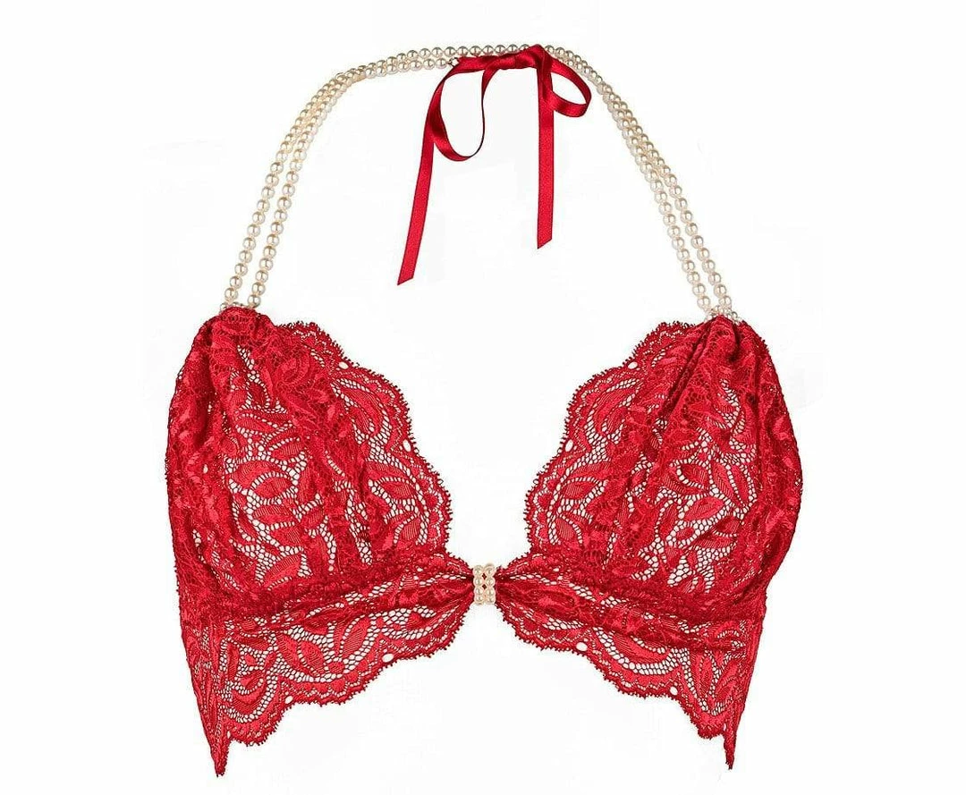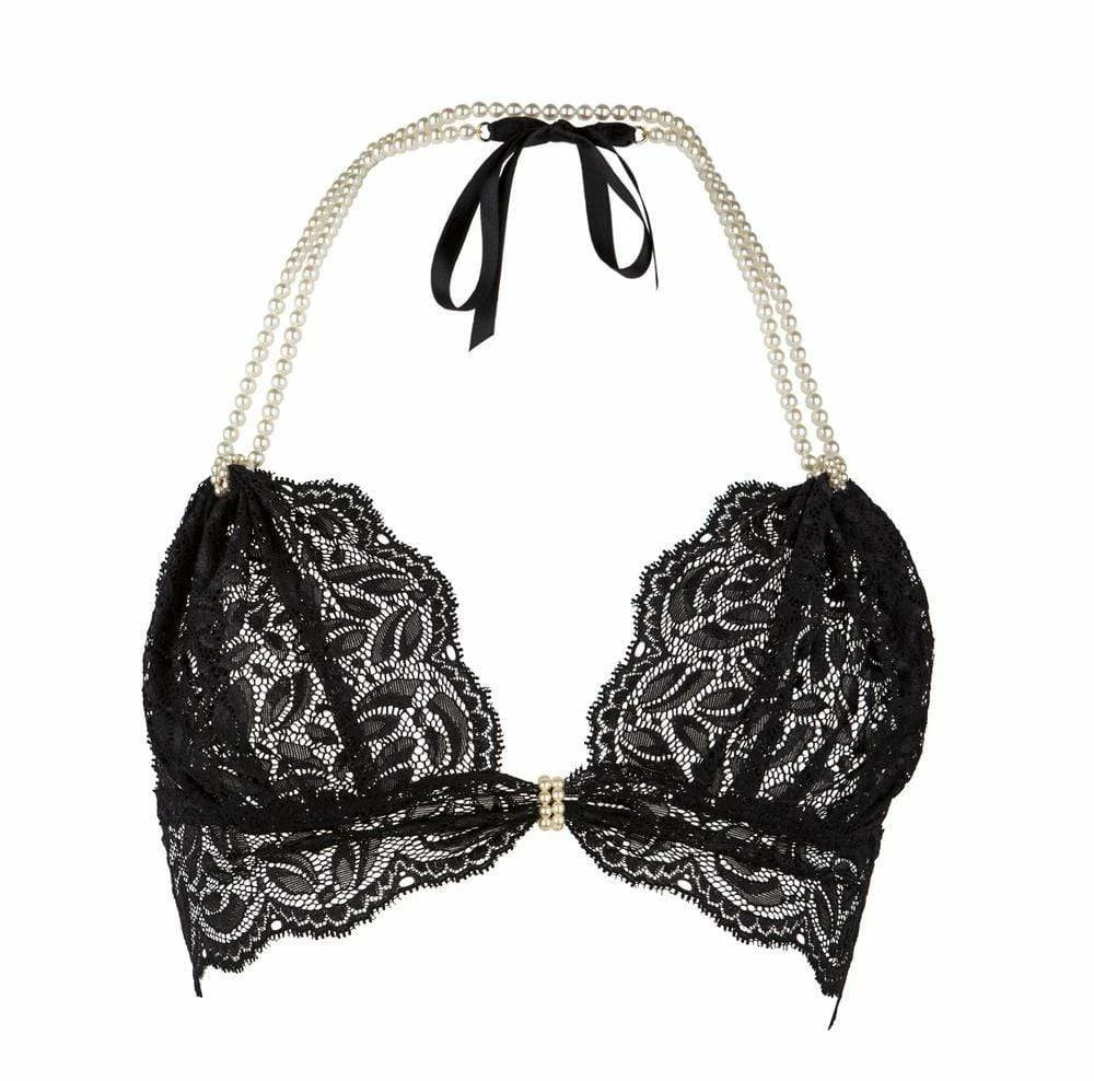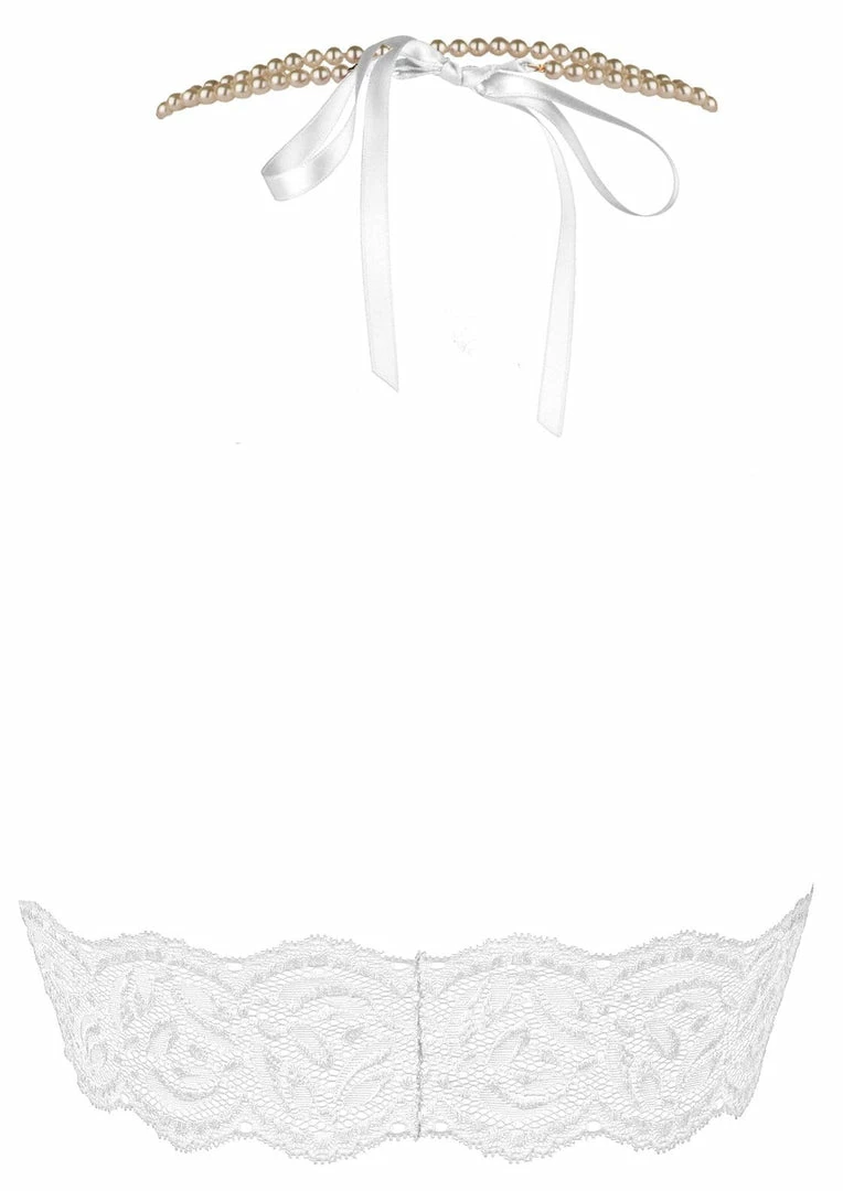 Named after the famed Spanish designer Begoña. The Paris Pearl Begos bra is an unlined, soft cup halter style whose cups can be adjusted for the perfect fit. Created from 100+ pearls of Manacor, the straps tie at the neck while a ring of pearls clasp the lace cups at the center of the chest. Imported from Spain.