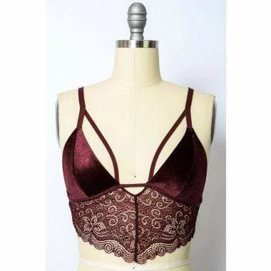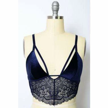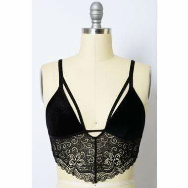 Strappy Velvet Lace Bra by Leto. Soft cup bralette can be worn under clothing for a teasing glimpse of by itself for a bold statement. Comfortable triangle top with strap details highlight clevage and lace details make for a soft but sexy look.