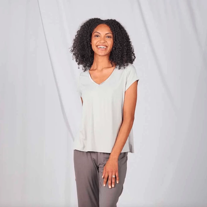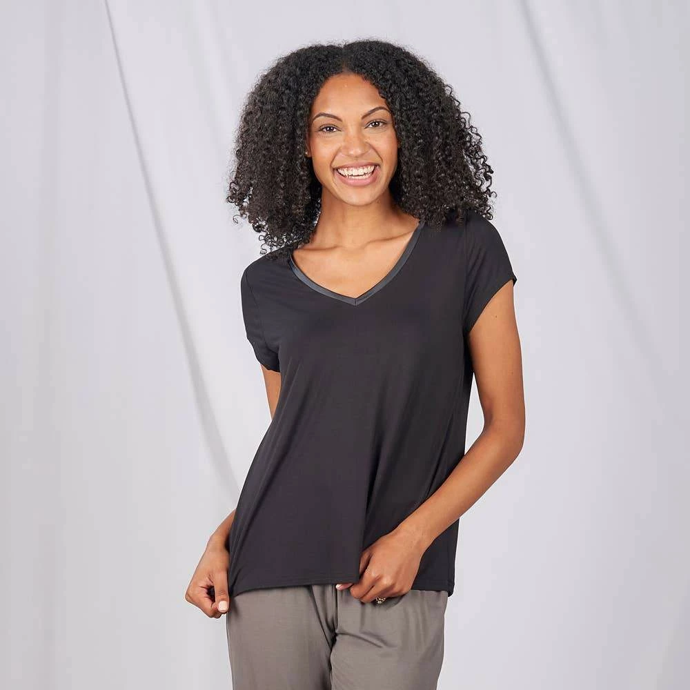 Incredibly soft, our V-Neck Tee Shirt is perfect for when you want to surround yourself in the coziest fabric around. With a delicate satin trimmed V down the front, this tee shirt is perfect. With plenty of wiggle room, the comfort level is off the charts.