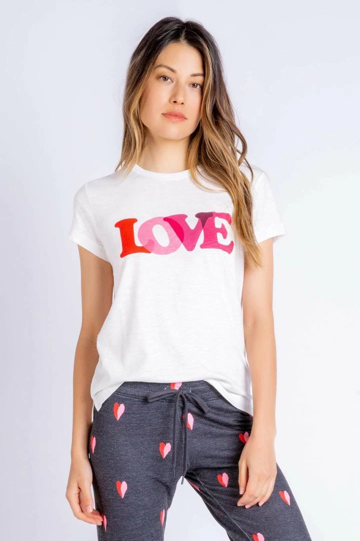 Soft and loose white t-shirt has a relaxed fit and LOVE in light and dark pink. Perfect for lounging or as a relaxed going out look.