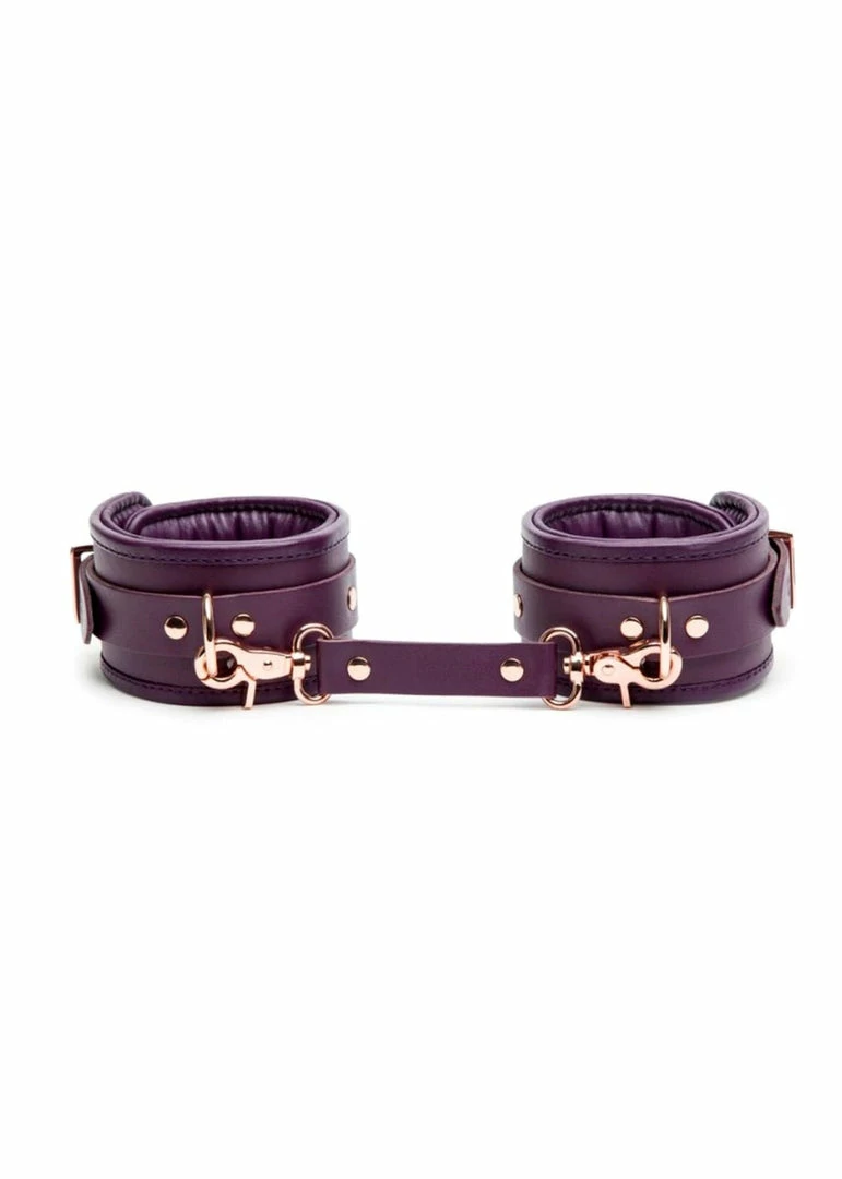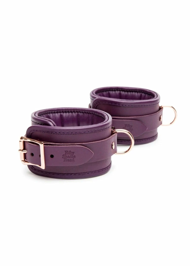 Purple leather padded ankle restraints. The Cherished Collection offers a variety of accessories for new and experienced lovers looking for kink.