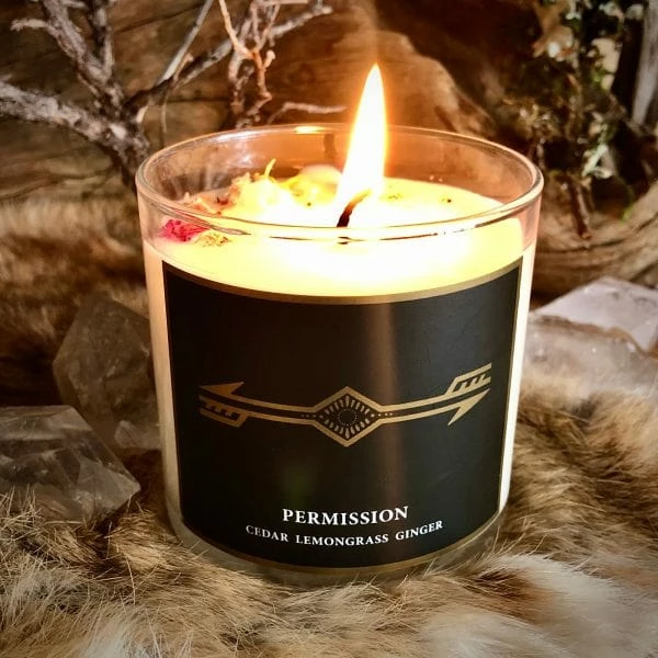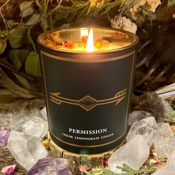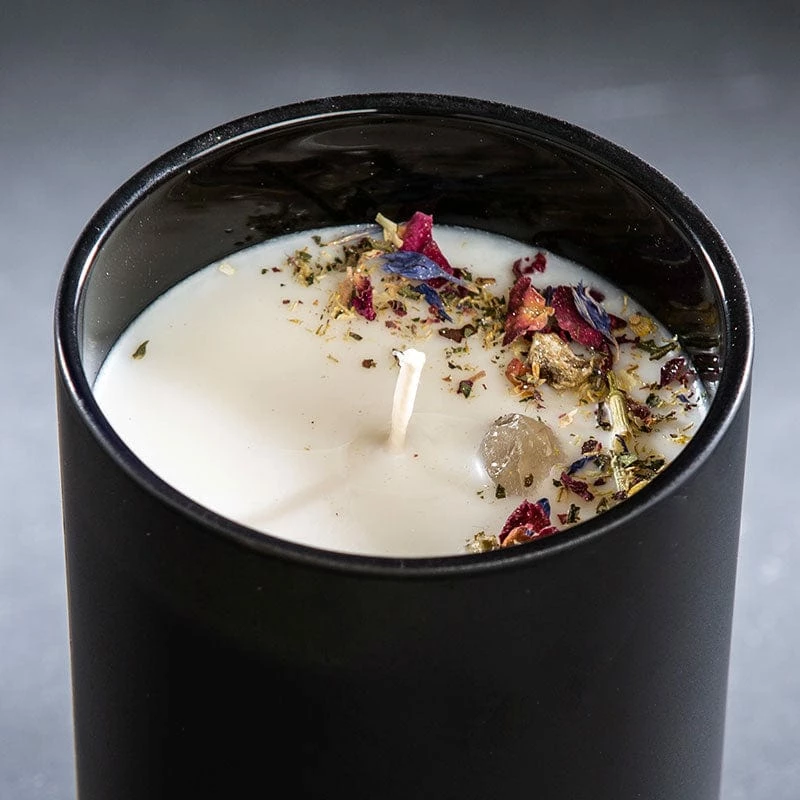Cotton wick, GMM-free soy wax, organic coconut oil, organic botanicals, cross roads dust, mica, proprietary blend of organic essential oils encasing a crystal charged under the full moon.