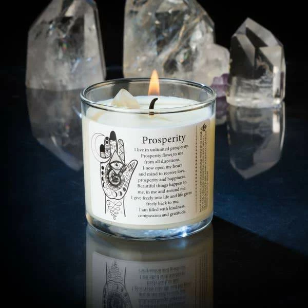 Cotton wick, GMM-free soy wax, organic coconut oil, proprietary blend of organic essential oils encasing a crystal charged under the full moon.