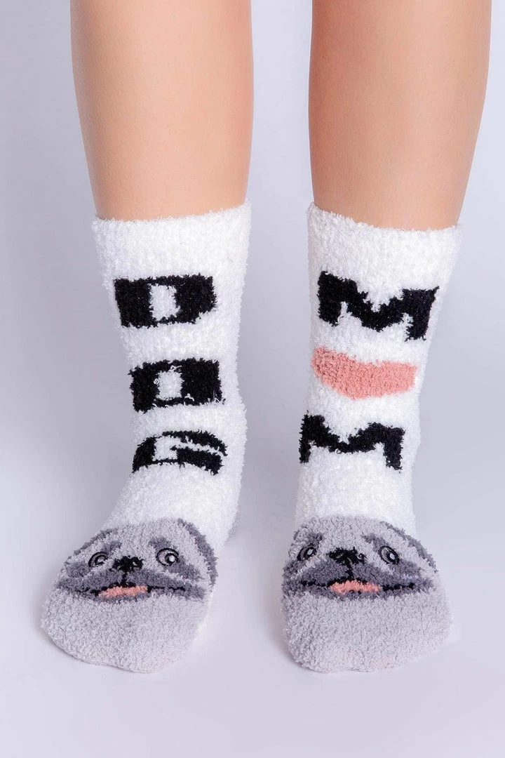 You love being a dog mom (or know someone who does). Say it proud in our dog mom cozy socks with a pug print on the toes. The bottom has a non-skid gripper print.