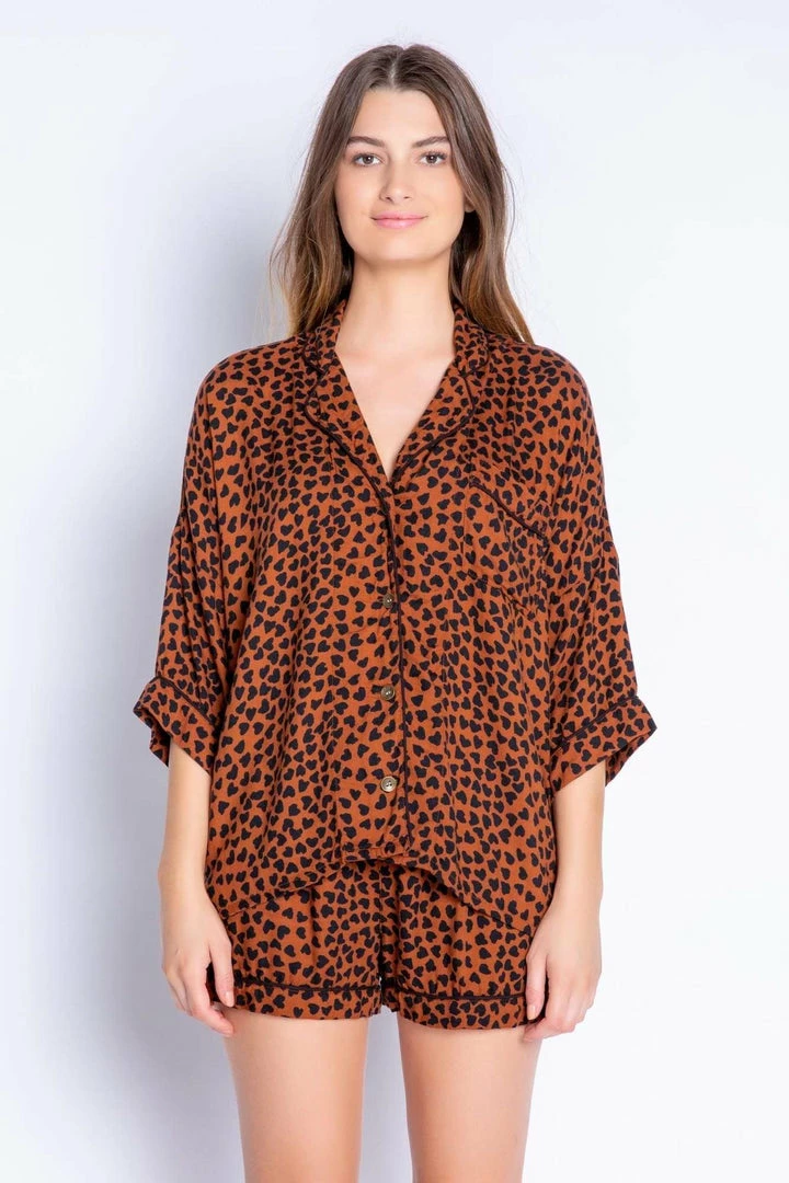 Soft flowing button up top and short set by PJ Salvage. Heart shaped animal print for a hint of sass even when lounging around.