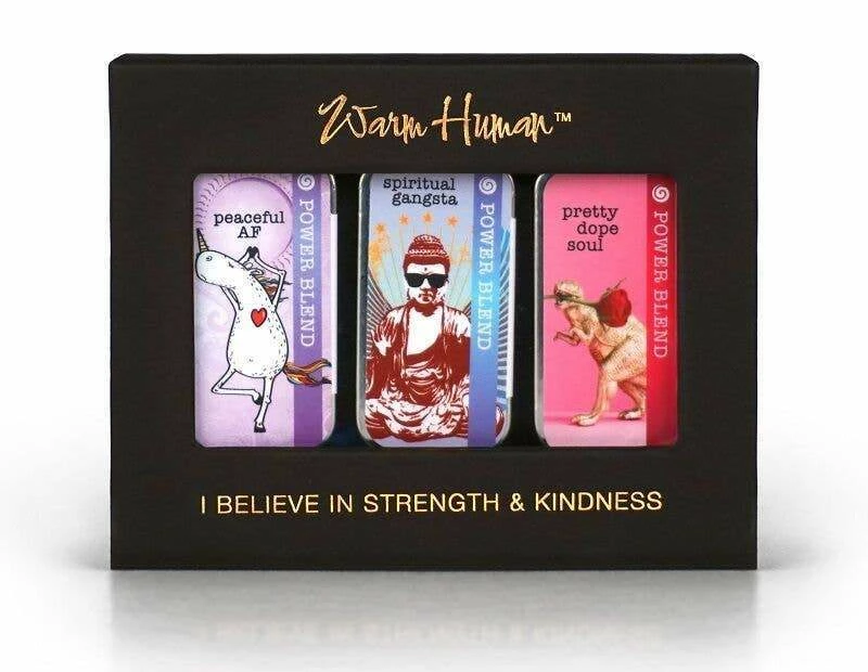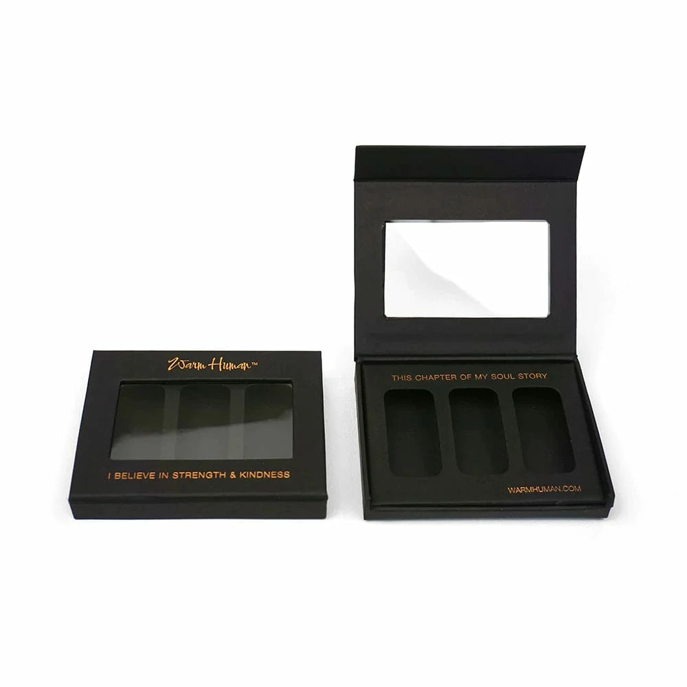 Our refillable compact is a friendly make-up size of 4.25″ x 3.6″ x 0.75″ + designed to hold 3 warm human aromatherapy solid scents. It has a wipeable, matte finish, metallic detailing + magnetic closure w/ window you can view your blend from while closed. You can open and close the scent tins as many times as you want, while they stay securely in place. It’s easy to change and replace different tins anytime, or pop them out to take them on the go! Great upsell item when customers buy 3 solids